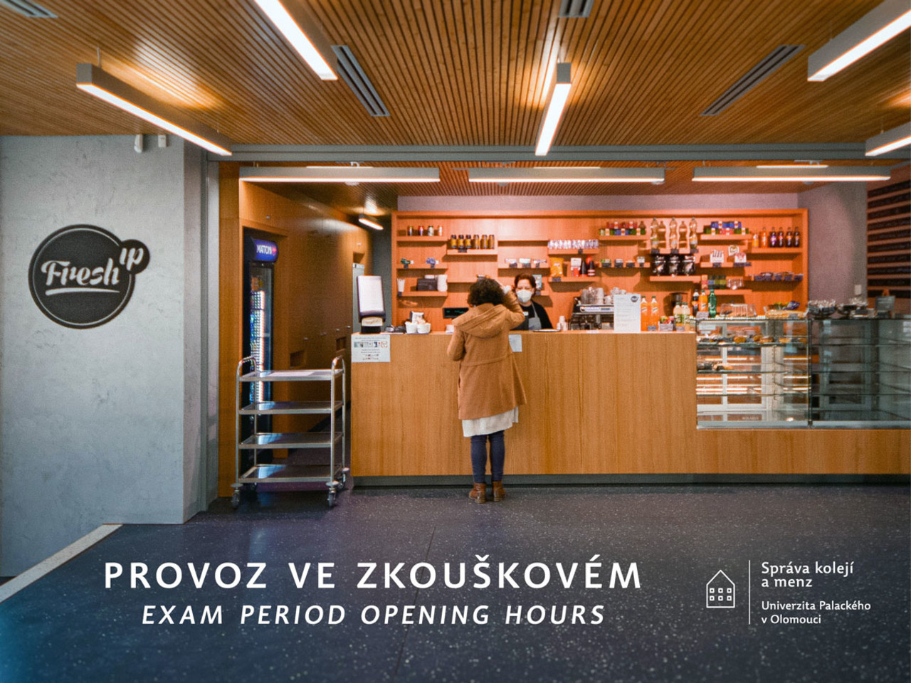 Běžnou provozní dobu budou mít do středy 20. prosince menzy 17. listopadu, Křížkovského, v Neředíně, v Holici a na lékařské fakultě, stejně tak FreshUPy na přírodovědecké fakultě na Envelopě, na filozofické fakultě na Křížkovského 10 a na pedagogické fakultě v atriu.