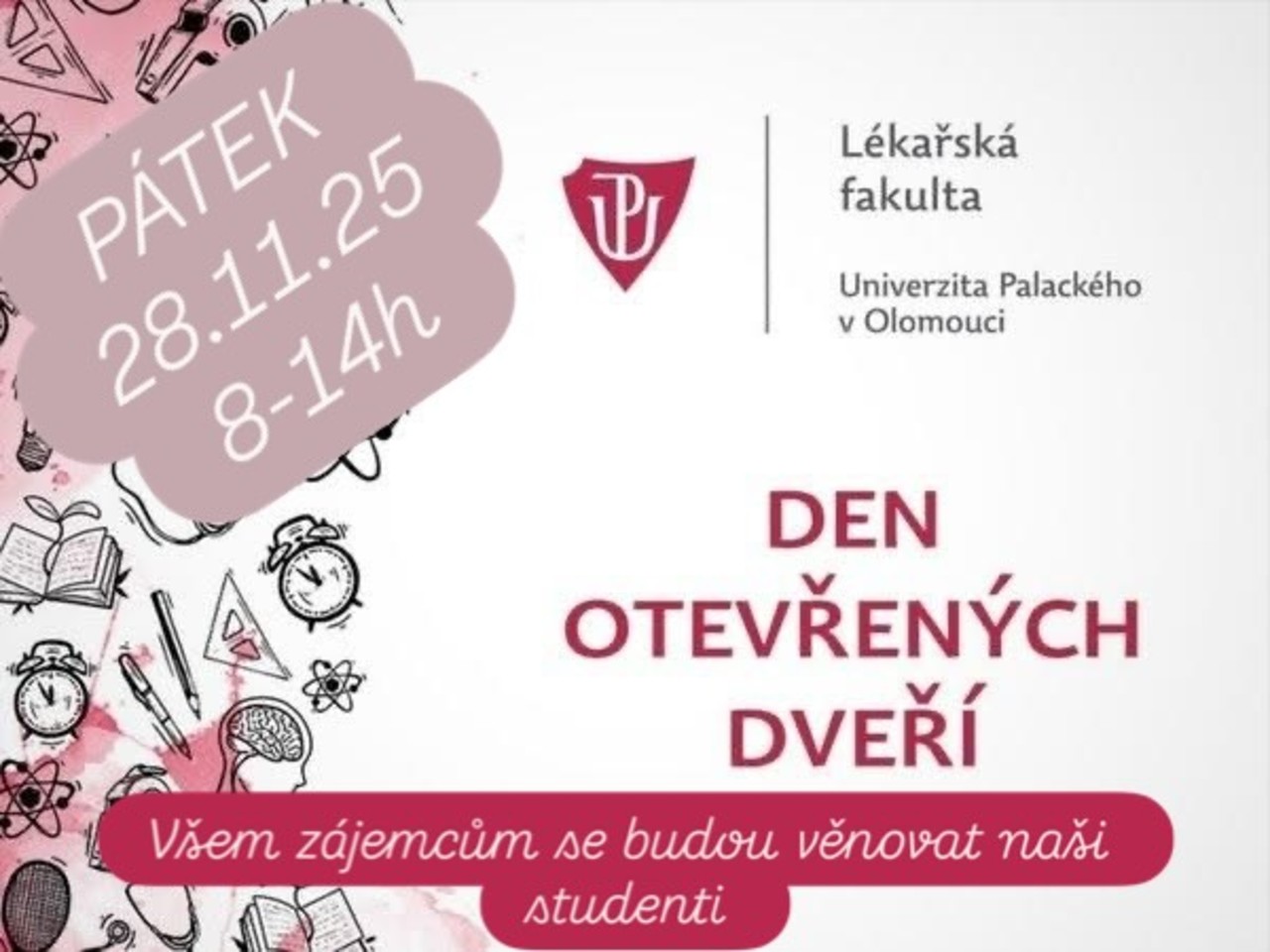 V pátek 28. 11. 2025 bude na naší fakultě Den otevřených dveří. Zájemci o studium se mohou zastavit k informačním stánkům se studujícími, kteří jim poskytnou základní informace o lékařské fakultě. Stanoviště budou u schodů ve foyer Teoretických ústavů a ve vstupních prostorech do nové budovy (obojí Hněvotínská 3, Olomouc) od 8 do 14 hodin.