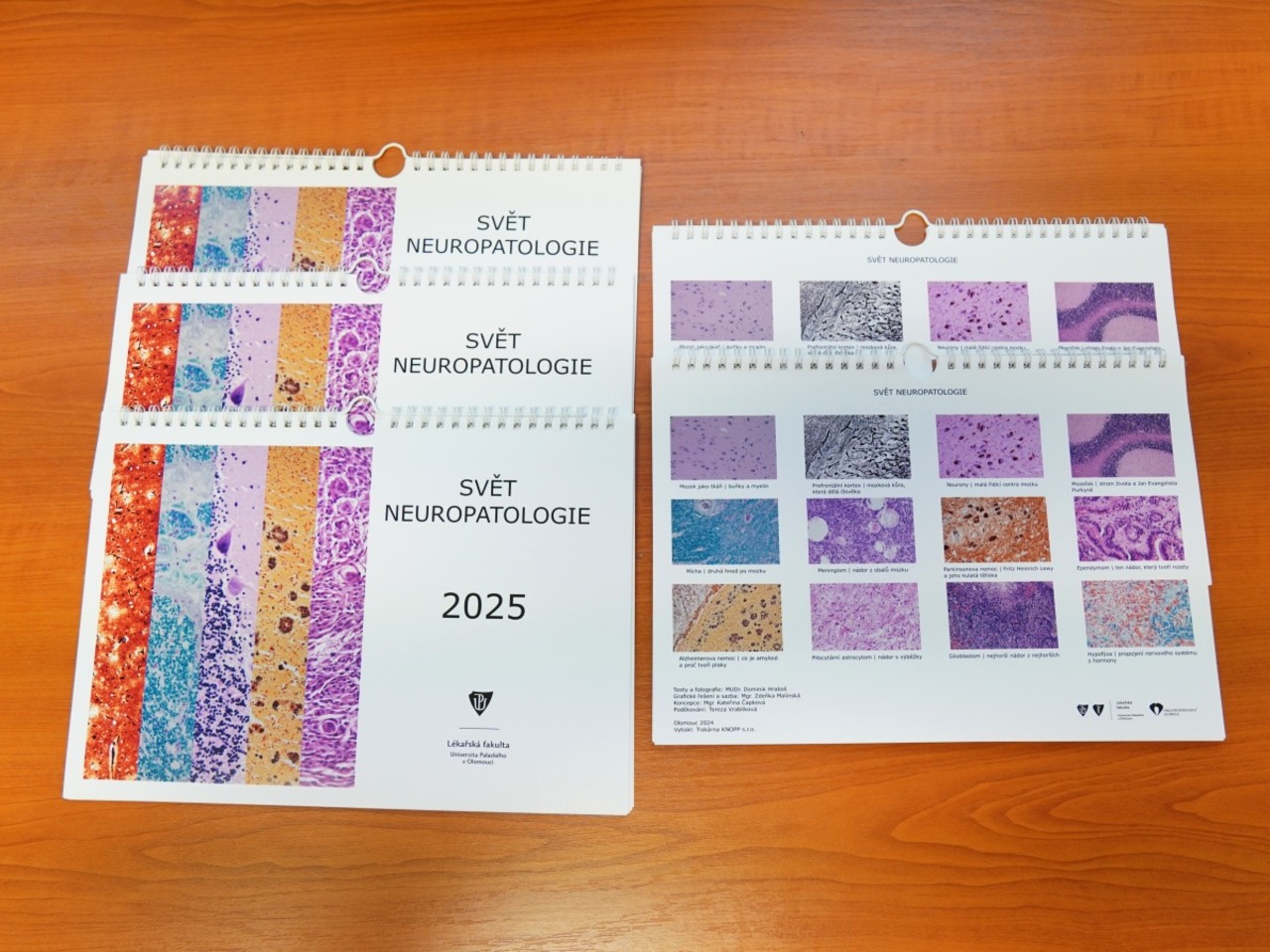 Nástěnný kalendář 2025 Lékařské fakulty UP SVĚT NEUROPATOLOGIE představuje neurodegenerace a mozkové nádory z pohledu patologa. Jedná se o soubor dvanácti detailních snímků nemocí, jako je například Alzheimerova a Parkinsonova nemoc; tedy celou škálu chorob, jejichž společným znakem je úbytek neuronů v různých oblastech mozku. Tyto mikroskopické snímky odhalují složitou architekturu jejich struktury – jak v běžném stavu, tak v průběhu nemocí.